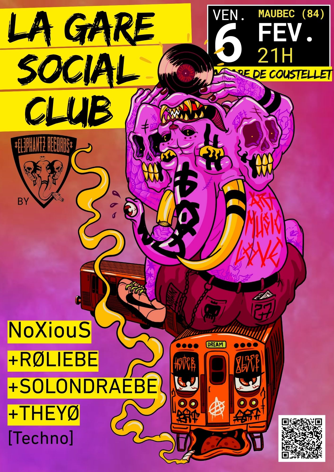 Pour bien démarrer l’année, La Gare confie à nouveau les platines à Elephantz Records, le label électro avignonnais. Pour cette seconde édition de La Gare Social Club, c’est NoXiouS, figure montante du collectif Tourista Debandade, qu’on invite à rejoindre RØLIEBE, SOLONDRAEBE et THEYØ du collectif des éléphants. Une soirée 100% techno, entre basses enveloppantes et rythmes puissants, pensée pour réchauffer les corps et les esprits au cœur de l’hiver.